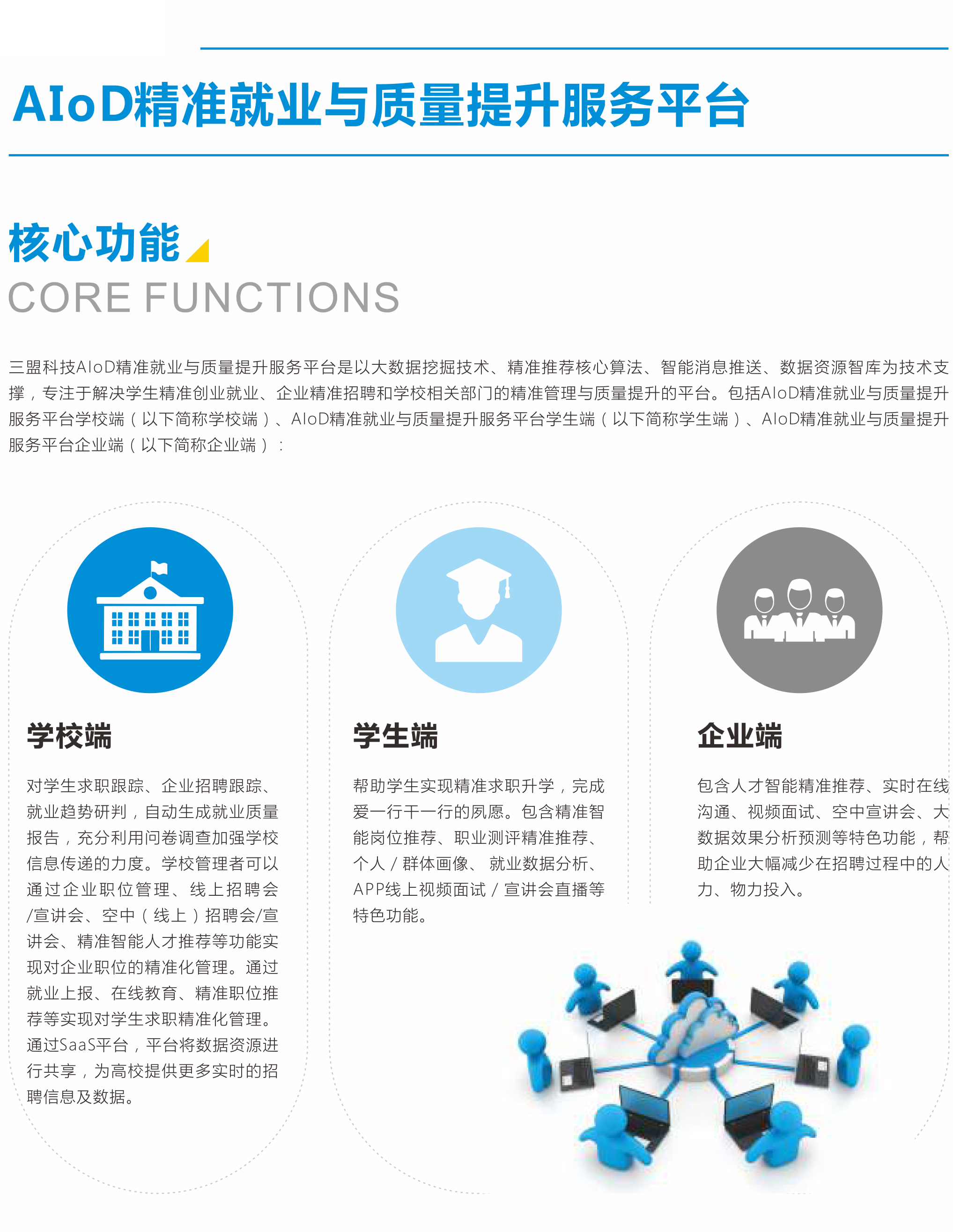 三盟科技AIoD大數據智能管理平臺是專注于教育行業(yè),通過校內外全量數據采集、處理、分析,為高校構建海量數據倉庫,挖掘數據核心價值,提供...