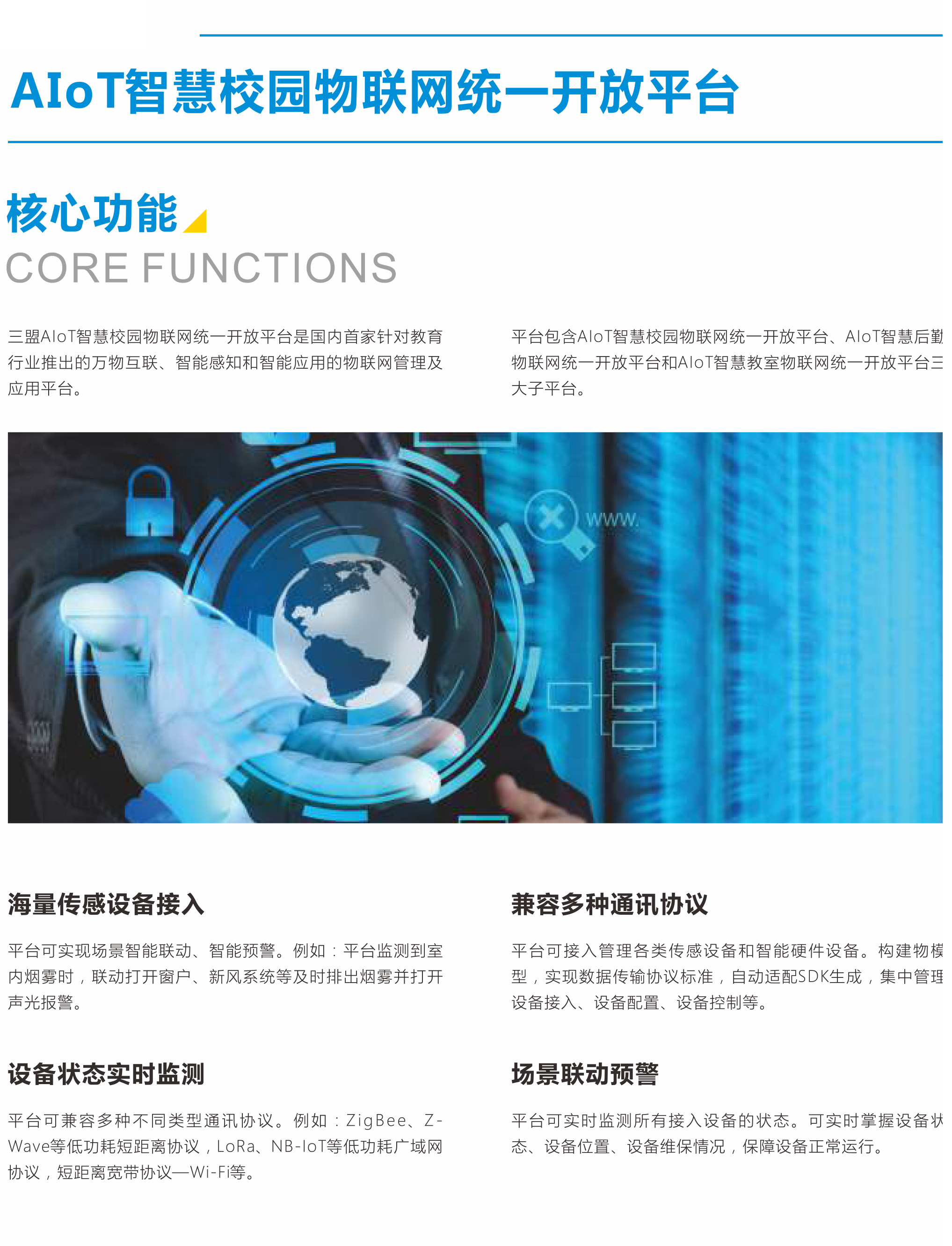AIoT智慧教室物聯網統一開放平臺是三盟科技AIoT智慧校園物聯網統一開放平臺重要組成部分。AIoT智慧教室物聯網統一開放平臺適用于學校對不...