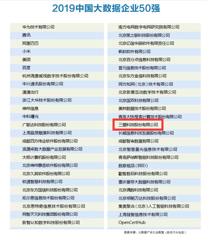 本次“2019中國大數據企業50強”評選不以企業規模為入選的核心考核指標,更加注重企業的大數據技術能力與行業應用之間的深度融合,對企業在大數據上的研發投入,大數據產品、解決方案及應用案例,大數據投融資需求及發展潛力等多個維度進行考核,覆蓋了中國大數據產業生態鏈上的各個細分環節。由知名高校、研究機構、行業用戶CIO、知名投資人、大數據企業領袖專家構成的專家委員會多輪評定,三盟科技從2000余家參選企業之中脫穎而出,與華為、騰訊、阿里、百度、小米等企業同時上榜由中國大數據產業生態聯盟組織評選的“2019中國大數據企業50強”。