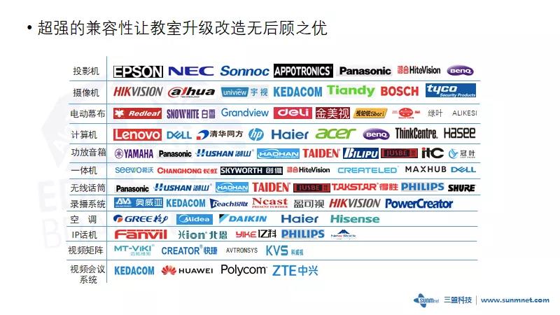 智校則不同,采用三盟科技自主研發(fā)的可編程中控系統(tǒng),所管理的多媒體教學(xué)設(shè)備可兼容市場(chǎng)上98%以上的品牌,因此校方不用擔(dān)心設(shè)備兼容性的問(wèn)題。