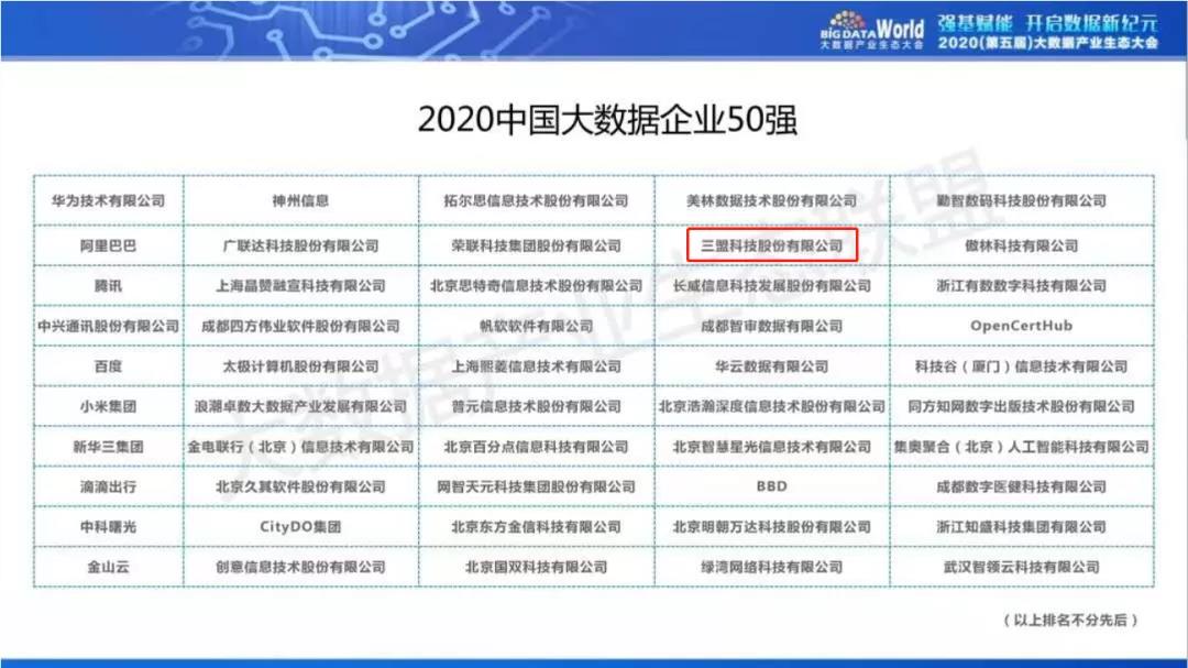 三盟科技憑借在大數據領域領先的技術優勢、成熟的解決方案及豐富的應用案例,從200多家大數據企業中脫穎而出,榮登“2020中國大數據企業50強”榜單。截至2020年,三盟科技已四度登榜“中國大數據企業50強”,印證了三盟科技在大數據領域取得的驕人成績。