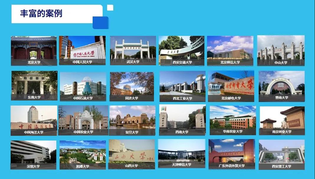 目前,大數據系列解決方案已在全國高校“落地開花”,成功在北京大學、北京師范大學、同濟大學、北京郵電大學、西安交通大學、武漢大學、中山大學等近500余所全國名校應用,其中包含50所雙一流院校/一流學科院校,100余所本科高校案例。