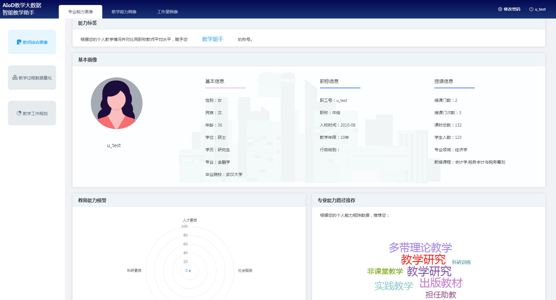 平臺通過綜合分析教師教學過程、教學內(nèi)容、教學行為、教學成果、教學評價等數(shù)據(jù),構(gòu)建教師綜合畫像,并根據(jù)教師的個人能力矩陣,推薦專業(yè)能力發(fā)展路徑,促進教師自我能力提升。