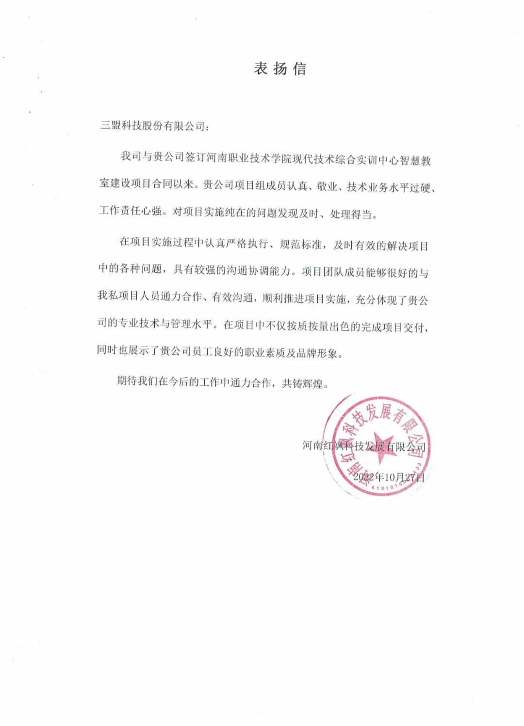 2022年8月,三盟科技與河南紅颯科技發展有限公司就河南職業技術學院現代技術綜合實訓中心智慧教室建設項目簽訂合作合同,期間三盟科技項目實施團隊,憑借認真、敬業、技術水平過硬、工作責任心強,對項目實施過程中存在的問題發現及時、處理得當,獲得校方和合作伙伴同事的高度認可。