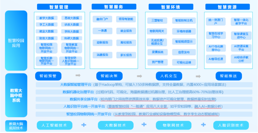 高教“教育大腦”是三盟科技面向高等院校推出的智慧校園整體解決方案。該方案深度融合人工智能技術AI、大數據技術AIoD、 物聯網技術AIoT、人臉識別技術AIoF四大核心技術,通過業務協同、流程優化、結構重塑、精準管理,助力高校構建集智慧環境、智慧資源、智慧管理、智慧服務于一體的智慧校園,旨在全方位提升教育管理效率教育決策科學化水平。