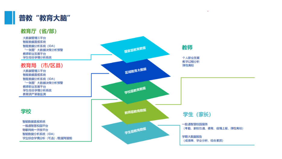 普教“教育大腦”則為中小學提供了智慧教育整體解決方案,通過打造教育數據中臺,幫助區域構建常態化數據采集、治理與標準開放體系,實現省、市、區縣、校數據橫向聯動、縱向互通。