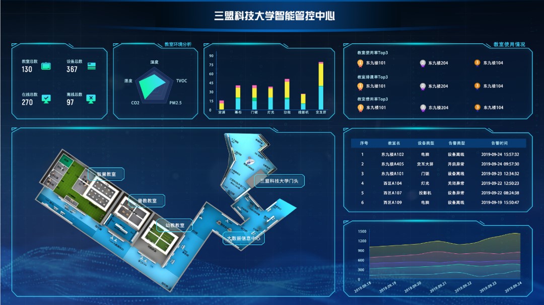 平臺自推出8年以來,已兼容產品共16大類、105個品牌、1020余種設備,實現對各類廠商設備的統一管控與數據互通。在平臺管理上,實現了通過1個平臺,就能對所有教室內設備、能源、空間進行集中管控。平臺還支持對教室相關的600+項數據進行分析,并依托AI技術預警預測各類設備故障問題,有效規避教學事故的發生。