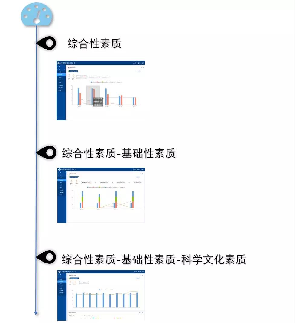 三盟科技的分析也一樣,平面和單一的結果展示無法對學校的診改工作起到實質性的幫助,只有逐層下鉆、深入分析,才能直達問題痛點。例如三盟科技的大數據診改平臺,對于學生的素質的下鉆分析展示如下: