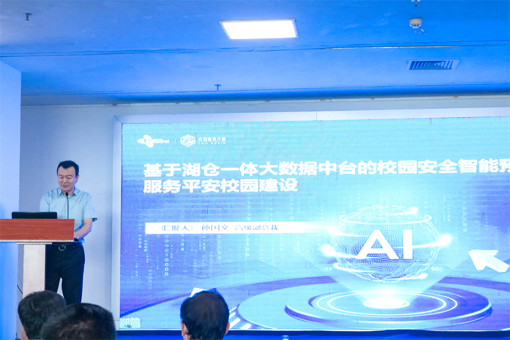 會上,三盟科技高級副總裁孫國文帶來《基于湖倉一體大數據中臺的校園安全智能預警預測平臺 服務平安校園建設》的主題報告。
