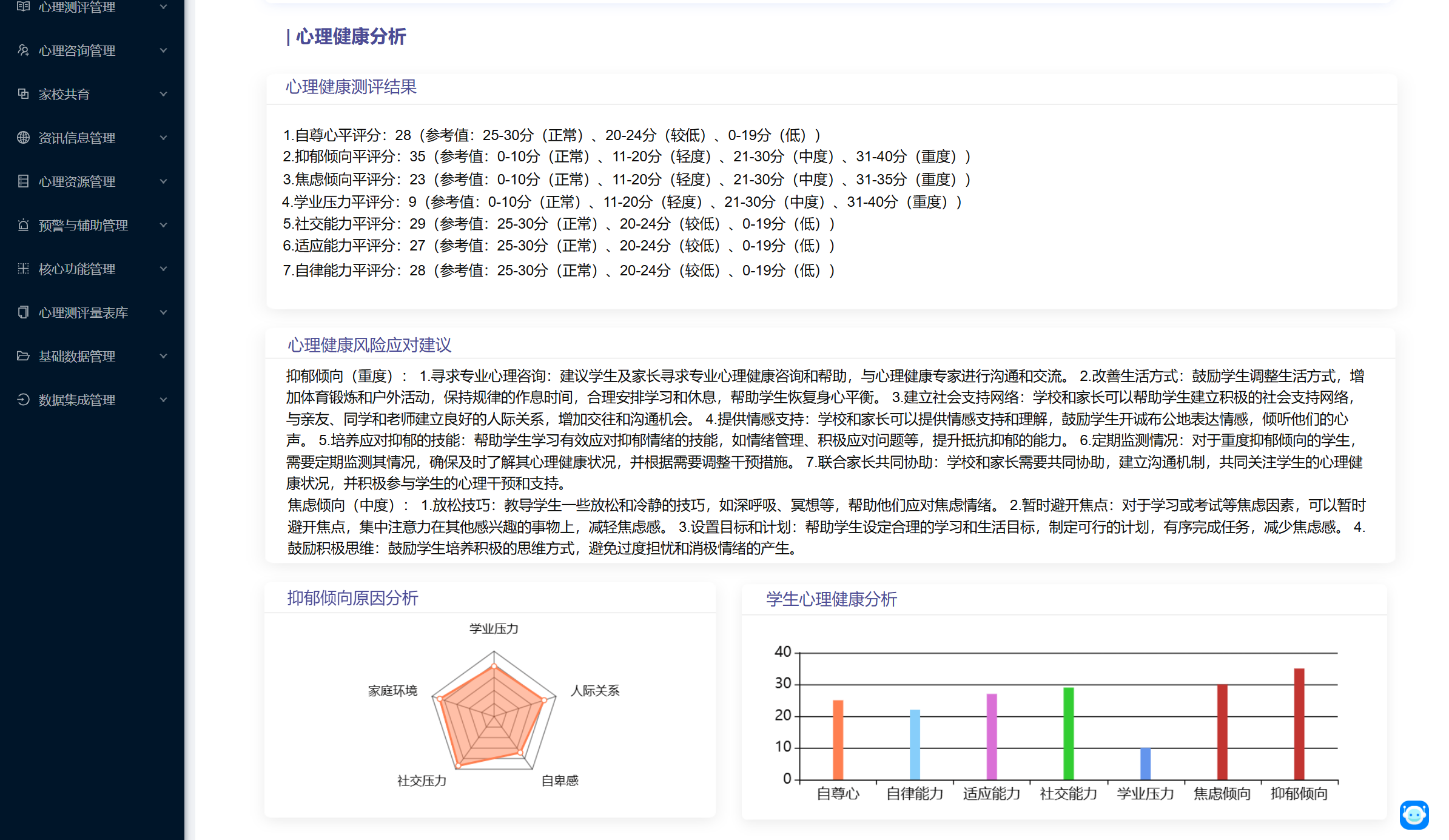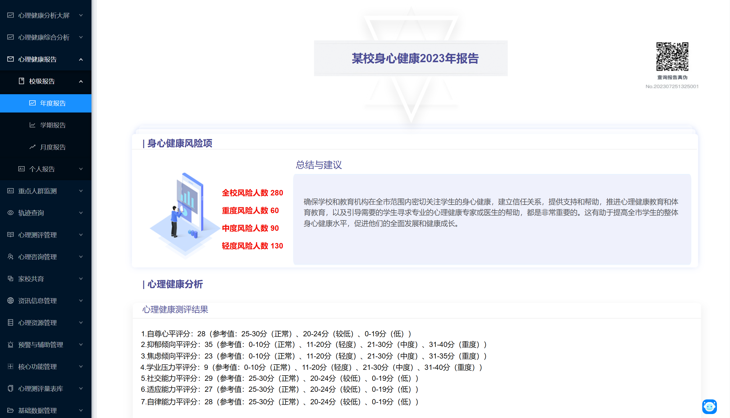 平臺根據學生心理健康監測結果,形成“校級、年級、班級、個體”四級心理健康監測報告。通過為教師、家長提供學生心理健康分析報告,引導教師和家長關注學生心理健康,樹立科學的培育觀念,不斷改善教育方式,為學生身心健康成長提供良好保障。通過打造家校協同育人生態圈,為學生營造美好的精神家園。