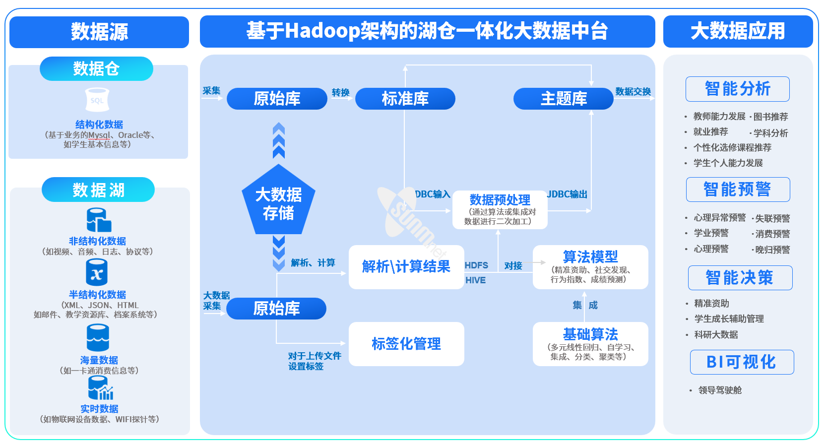 基于此,三盟科技依托自身在教育大數(shù)據(jù)領(lǐng)域積累的技術(shù)優(yōu)勢與服務(wù)經(jīng)驗(yàn),為高校匠心打造湖倉一體數(shù)據(jù)中臺(tái)。平臺(tái)旨在幫助學(xué)校聚合和治理海量異構(gòu)數(shù)據(jù),完善數(shù)據(jù)治理標(biāo)準(zhǔn)和規(guī)范,打造高質(zhì)量的全量數(shù)據(jù)底座,有力驅(qū)動(dòng)高校的數(shù)字化轉(zhuǎn)型穩(wěn)步向前。