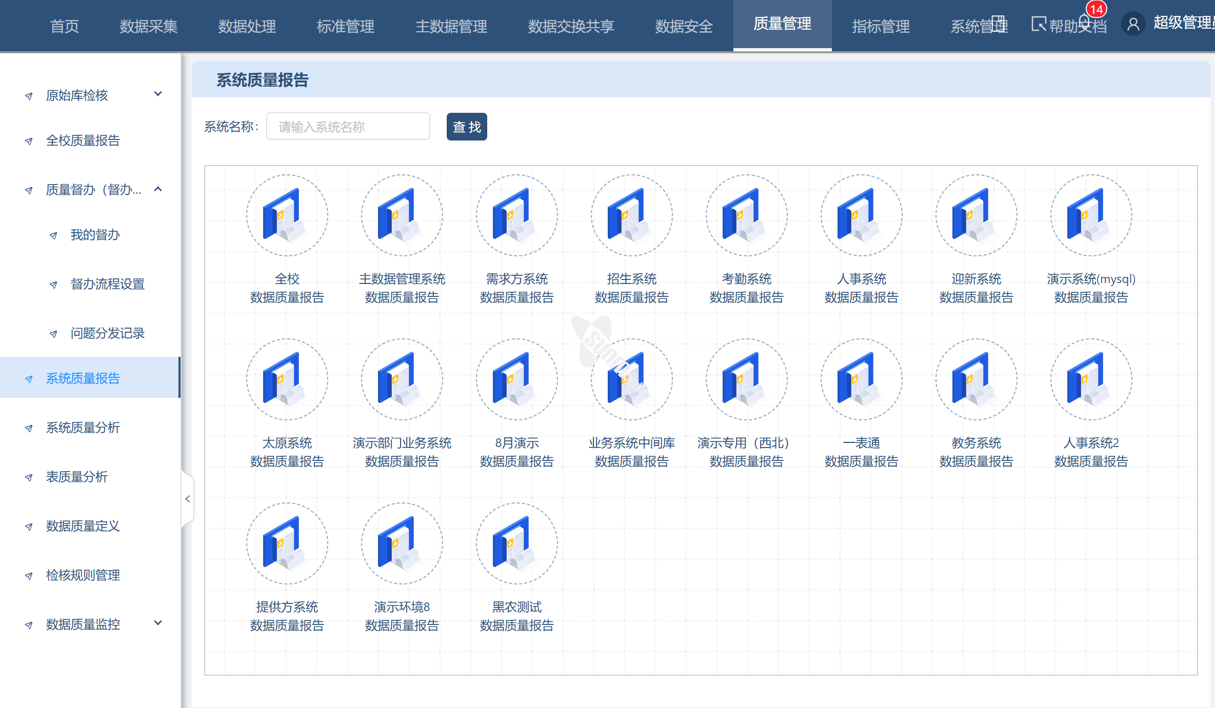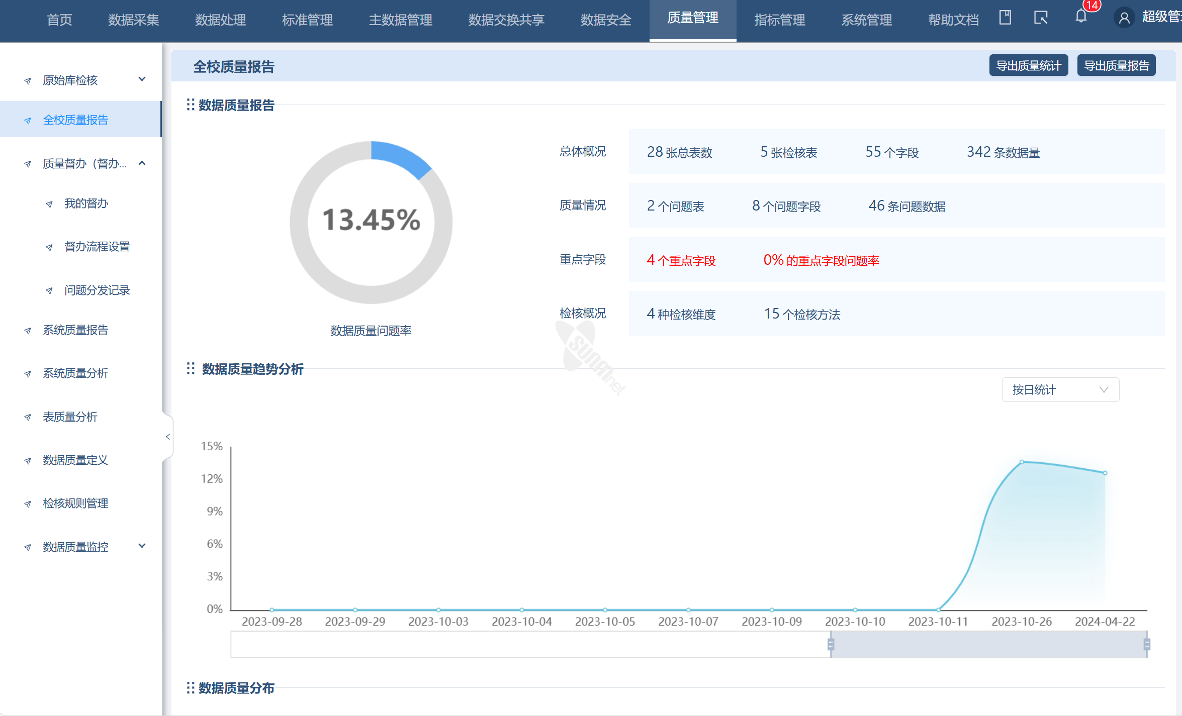 此外,在數(shù)據(jù)質(zhì)量管理方面,平臺(tái)還支持對表進(jìn)行質(zhì)量檢查,同時(shí)生成數(shù)據(jù)質(zhì)量報(bào)告,并將數(shù)據(jù)質(zhì)量反饋給相關(guān)部門,讓其清晰了解數(shù)據(jù)情況。以此形成學(xué)校常態(tài)化數(shù)據(jù)治理體系,推進(jìn)學(xué)校數(shù)據(jù)質(zhì)量穩(wěn)步上升。