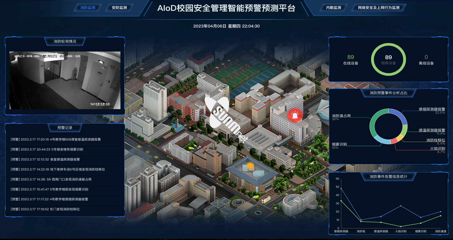 平臺具有識別火焰、煙霧等功能,支持對火情自動探測、自動報警、自動定位,為學(xué)校各個建筑場所筑起一道智能“防火墻”。一旦遇到火情,平臺可精準(zhǔn)定位火點(diǎn)坐標(biāo)并進(jìn)行遠(yuǎn)程告警,有效實現(xiàn)校園火災(zāi)早發(fā)現(xiàn)、早預(yù)警、早處置。