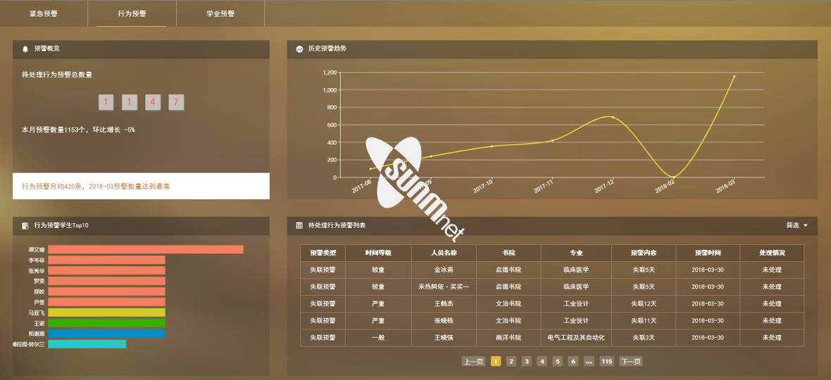 學(xué)生心理問題往往隱于冰山之下,深不可測。一旦出現(xiàn)異常行為更是難以防范,平臺提供了預(yù)警與防范之法,通過采集校內(nèi)學(xué)生多維度數(shù)據(jù)生成學(xué)生個人畫像和群體畫像,并結(jié)合學(xué)生近期行為表現(xiàn),及時發(fā)現(xiàn)并預(yù)警學(xué)生心理、行為的異常變化,提前告警學(xué)生掛科、消費(fèi)、夜歸、逃課、沉迷網(wǎng)絡(luò)等信息,有效預(yù)防學(xué)生安全事故的發(fā)生。