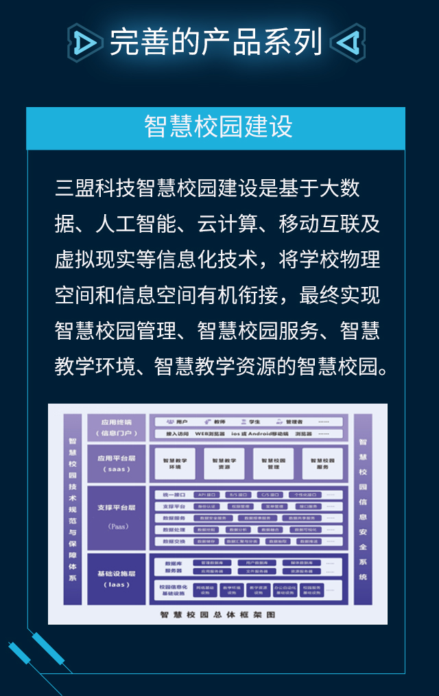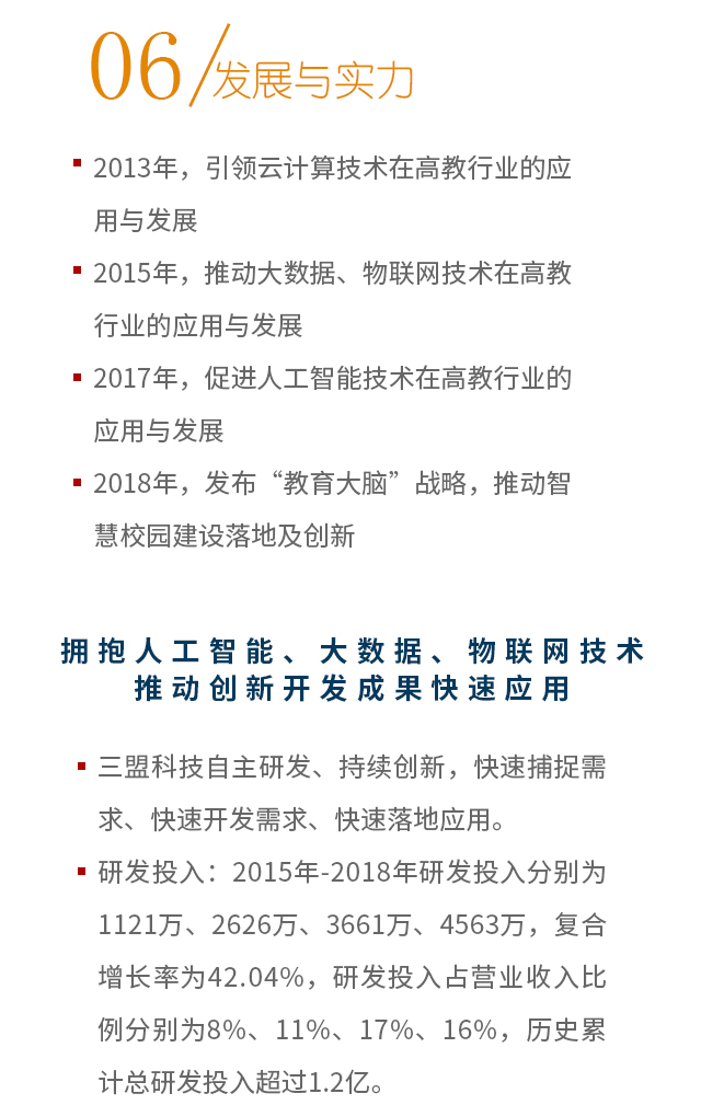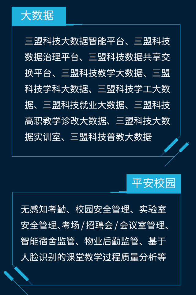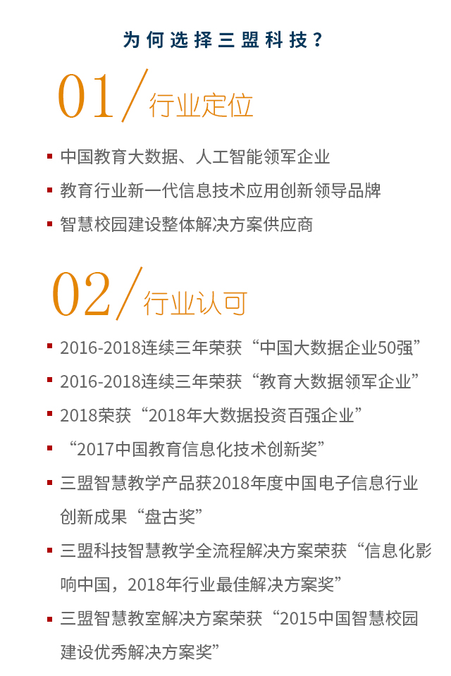 三盟科技股份有限公司(簡稱三盟科技)是一家專注AI+大數據技術,專注教育,將AI+大數據技術與教育行業應用場景深度融合,自主創新研發,為教育數字化提供整體解決方案的軟件技術服務商。