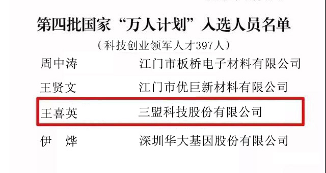 重磅!熱烈祝賀三盟科技董事長王喜英女士入選國家“萬人計劃”
