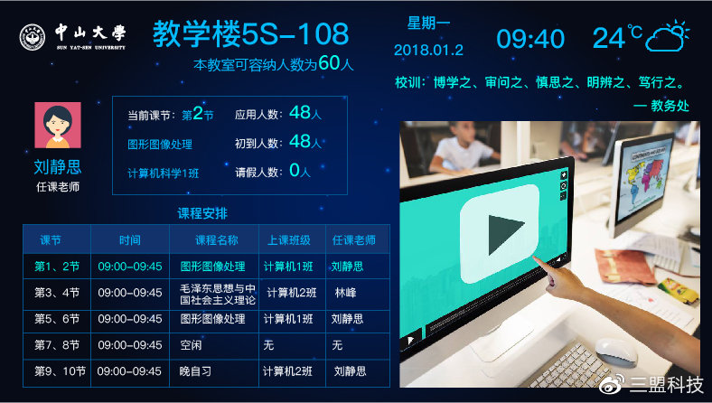 三盟智能控制及數據采集平臺與學校信息發布系統無縫對接,數據信息動態更新,將高校所有的公共教室資源以大數據的形式置于云端,以最為簡易的操作流程和整潔大方的外觀設計展現在網頁、客戶端。