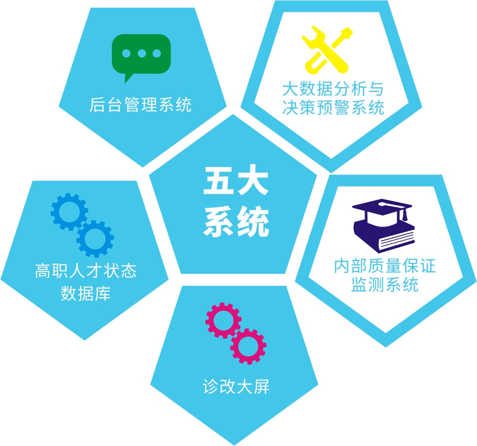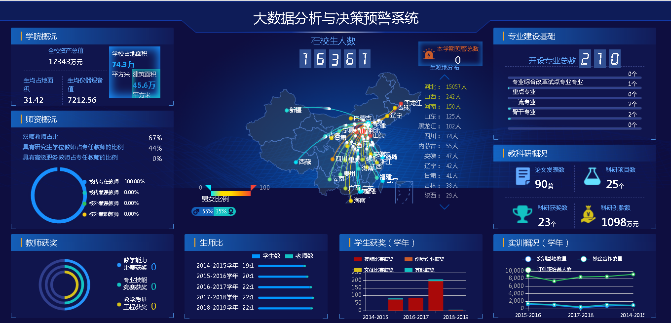現在,大數據分析與決策預警系統提供診改決策數據支持及“五橫”畫像分析展示,具體提供包含學校、專業、課程、師資、學生維度的畫像展示。并且具有單獨的預警模塊,實時、動態的掌握全校發展,為及時糾偏提供大數據的支持。