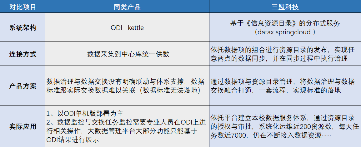 三盟數據治理與共享交換平臺是以“統一標準”、“統一處理”、“統一交換”、“保證質量”、“透明開放”的方式,為不同業務系統、不同數據庫、不同數據格式之間進行數據交換而提供服務的平臺。