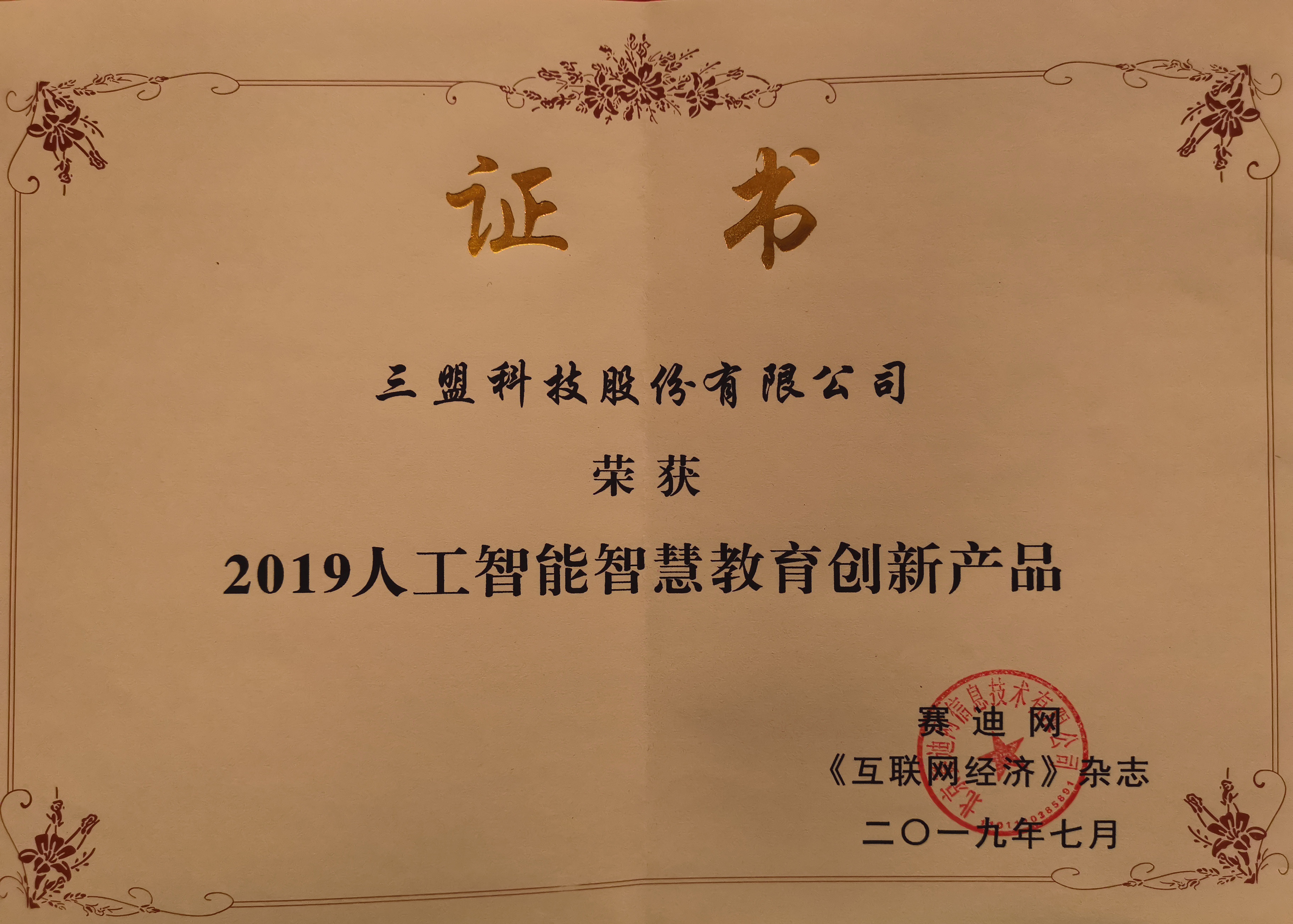 2019年7月26日,由中國電子信息產業發展研究院指導,賽迪網、《互聯網經濟》雜志聯合舉辦的“2019行業信息化技術創新發展峰會暨行業信息化獎項評選”在北京舉行,三盟科技股份有限公司(以下簡稱“三盟科技”)作為新一代智慧教室解決方案供應商,再獲認可,摘得“人工智能智慧教育創新獎”。(見上圖中)