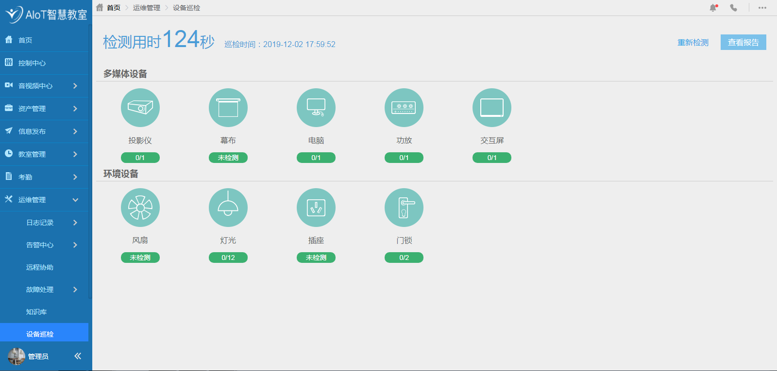 從設備自檢—故障告警—故障處理—知識庫—數(shù)據報表,AIoT智慧教室物聯(lián)網統(tǒng)一開放平臺進行可視化運維管理,隨時隨地掌控設備運行狀況,