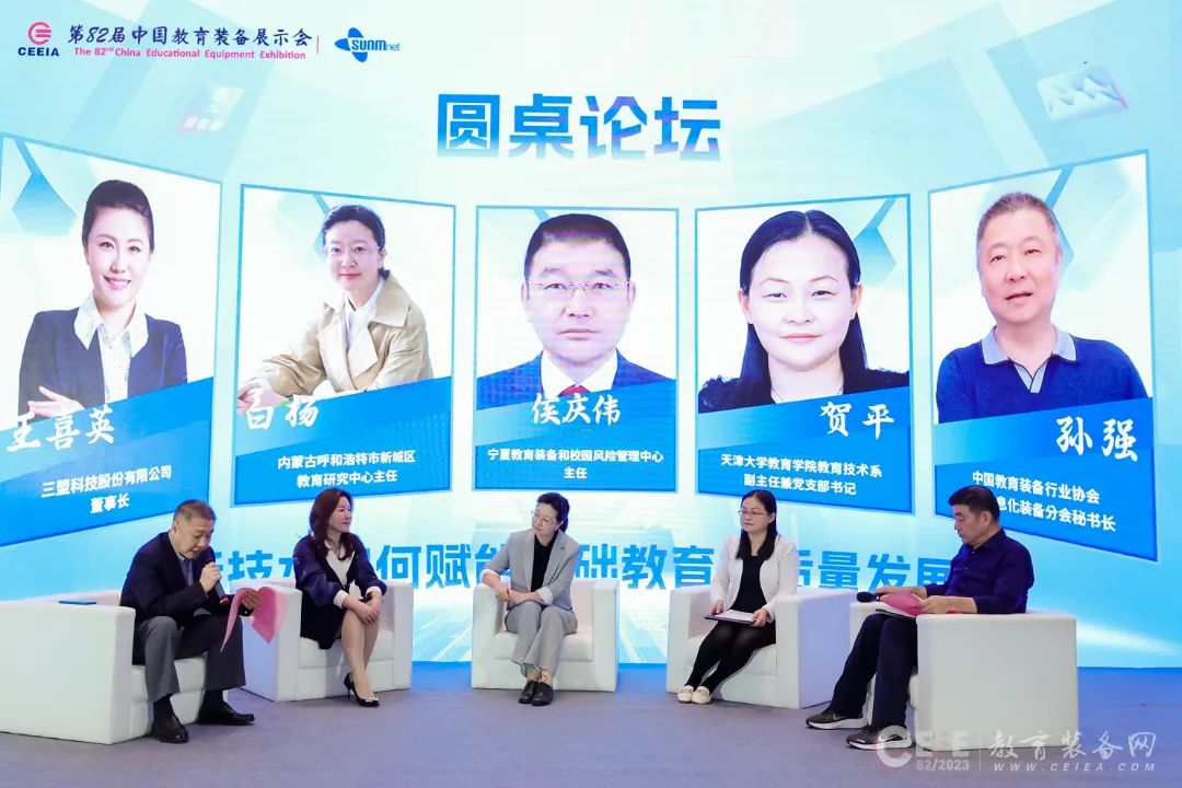 圓桌論壇環節,寧夏教育裝備和校園風險管理中心主任侯慶偉、天津大學教育學院教育技術系副主任兼黨支部書記賀平、內蒙古呼和浩特市新城區教育研究中心主任白楊、三盟科技股份有限公司董事長王喜英作為對話嘉賓,共同圍繞“新技術如何賦能基礎教育高質量發展”這一主題展開精彩討論。