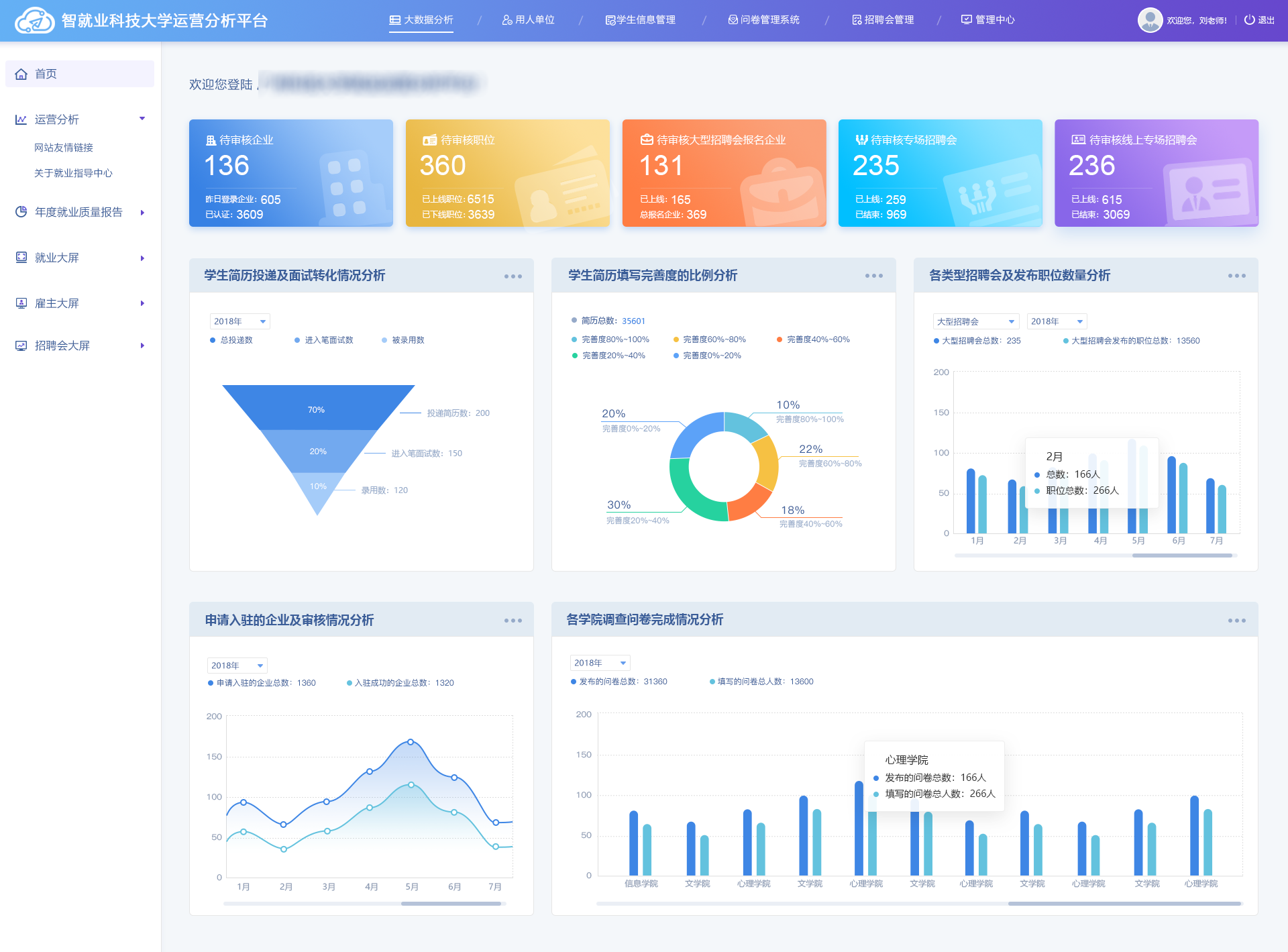 提供學生動態求職分析、雇主實時招聘分析、行業發展趨勢分析、市場人才需求趨勢分析