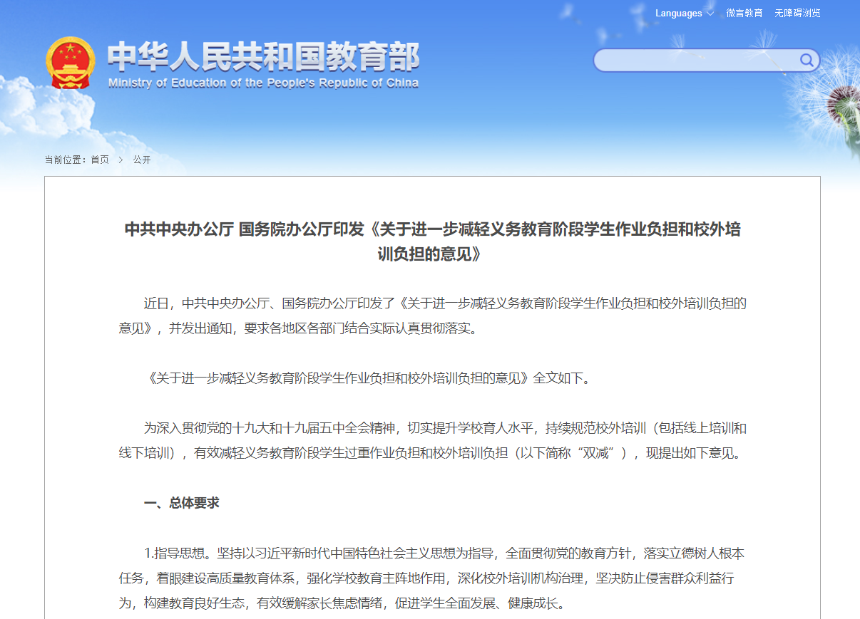 2021年7月24日,中共中央辦公廳、國務院辦公廳印發了《關于進一步減輕義務教育階段學生作業負擔和校外培訓負擔的意見》(以下簡稱“雙減”),提出要強化學校教育主陣地作用,進一步提升學校教育教學質量和服務水平;持續規范校外培訓,有效減輕義務教育階段學生過重作業負擔和校外培訓負擔。