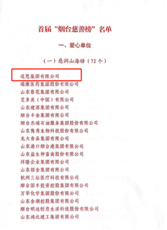 道恩上榜首屆“煙臺慈善榜”,成為“最具愛心企業(yè)”